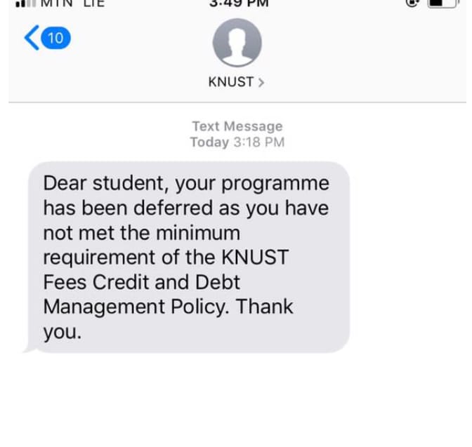 However, some students started receiving messages from the university’s administration on Tuesday afternoon that they have been deferred due to their inability to meet the minimum requirements of KNUST fees Credit and Debt Management Policy.