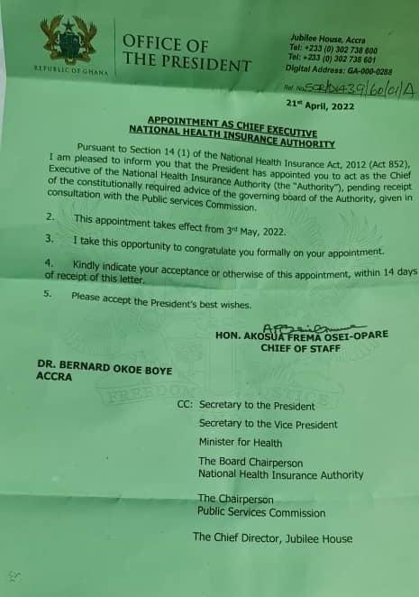‘I am pleased to inform you that the President has appointed you as the Chief Executive of the National Health Insurance Authority (the “Authority”), pending receipt of the constitutionally required advice of the government board of the Authority, given in consultation with the Public services Commission” Frema Osei-Opare stated in the letter.