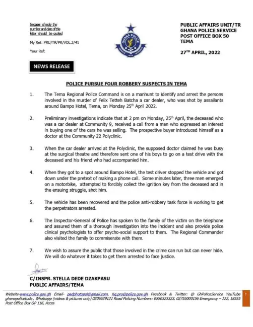 According to the police, the four suspects shot and killed the deceased Felix Tetteh Batcha, a car dealer at Community 9, on Monday, April 25, 2022.
