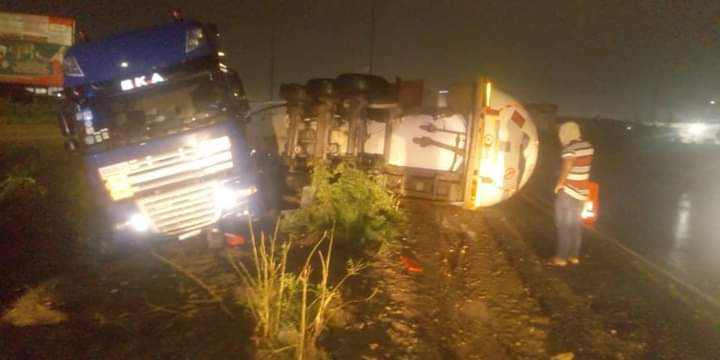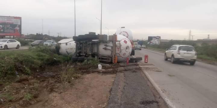 A gas tanker with registration number GN 4513-21 and filled with LPG has been involved in a crash on the motorway.
