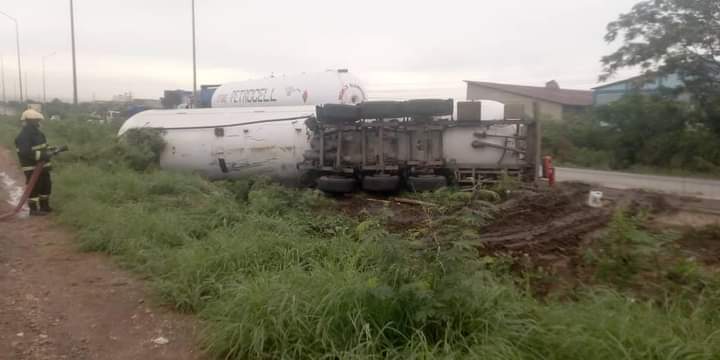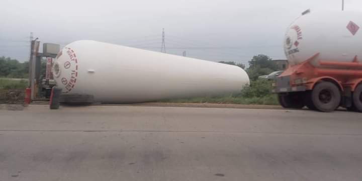 Firemen are still at the scene managing the situation while the crew await the arrival of another Gas Tanker Truck to transfer the gas product.