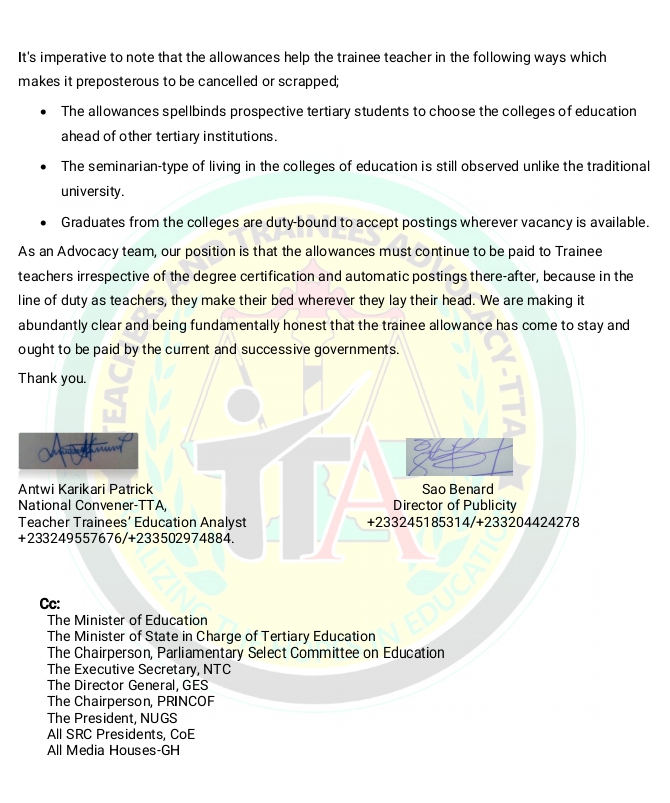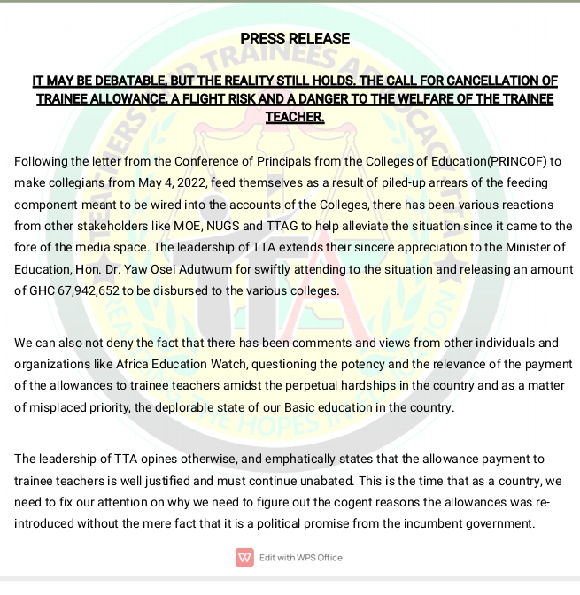 A statement issued by the association and co-signed by the Director of Publicity, Sao Bernard and the National Convener of TTA, Antwi Karikari Patrick, said, the ongoing debate to scrap the trainee teachers allowance poses a “risk and a danger to the welfare of the trainee teacher.”