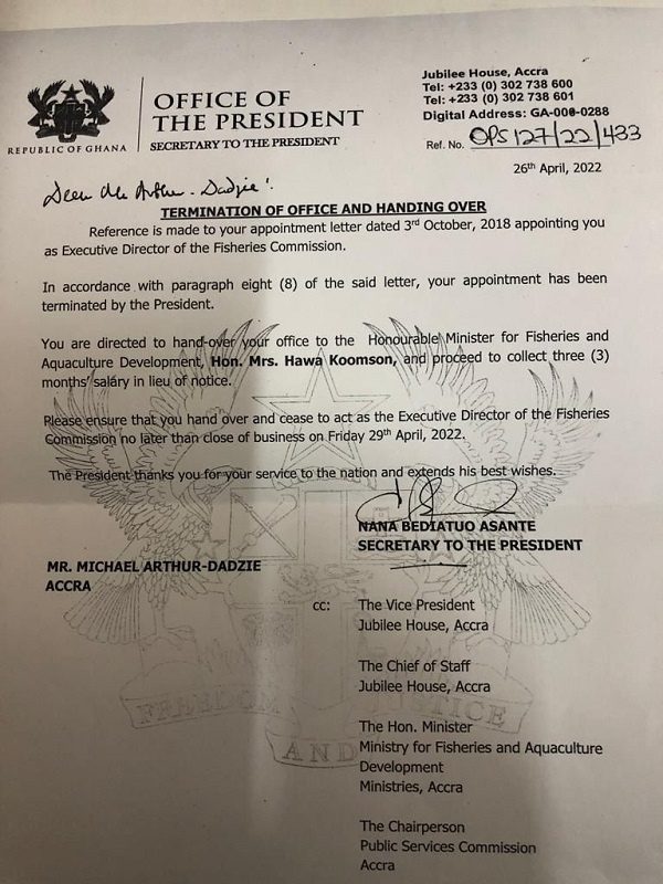 “Please ensure that you hand over and cease to act as the Executive Director of the Fisheries Commission no later than close of business on Friday, 29th April, 2022,” part of the letter read.