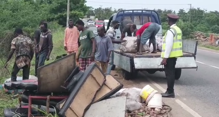 “We received a call that there has been an accident and we dispatched our men to the scene. It was a sprinter bus filled with cassava from Mankessim to Accra that had burst a tyre. The driver lost control and ran into a light pole.”