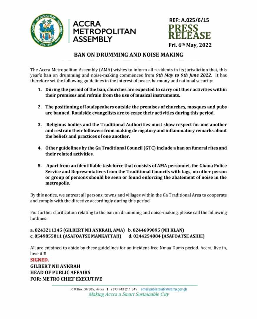 The Accra Metropolitan Assembly (AMA), has announced that this year’s ban on drumming and noise making in the Greater Accra Region commences from Monday, May 9 to Thursday, June 9, 2022.