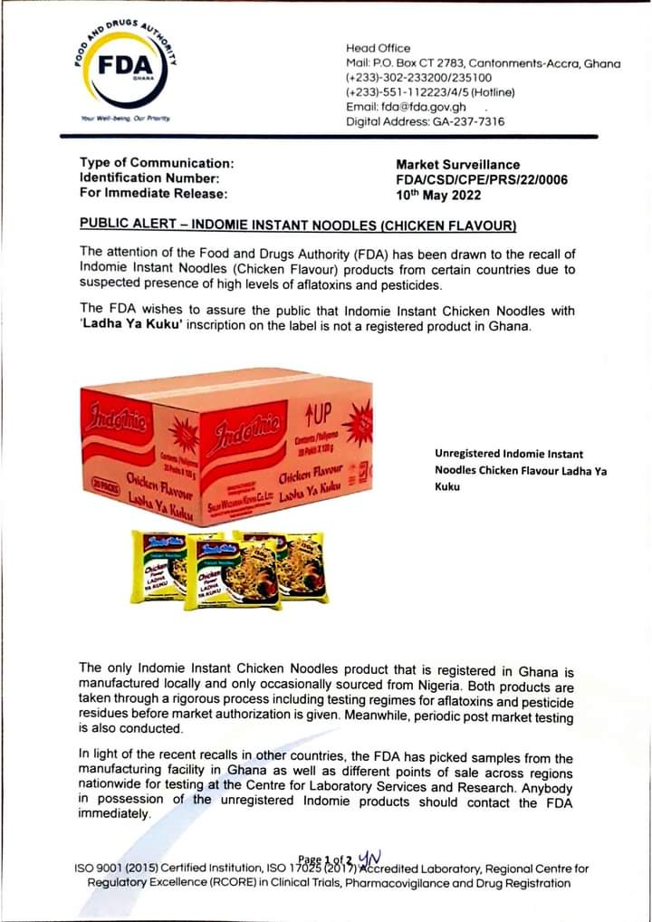 The FDA in a statement dated Tuesday, May 10, 2022, and signed by the DCEO, Corporate Service Division, Mrs. Yvonne Nkrumah, said the “only Indomie Instant Chicken Noodles product that is registered in Ghana is manufactured locally and only occasionally sourced from Nigeria”