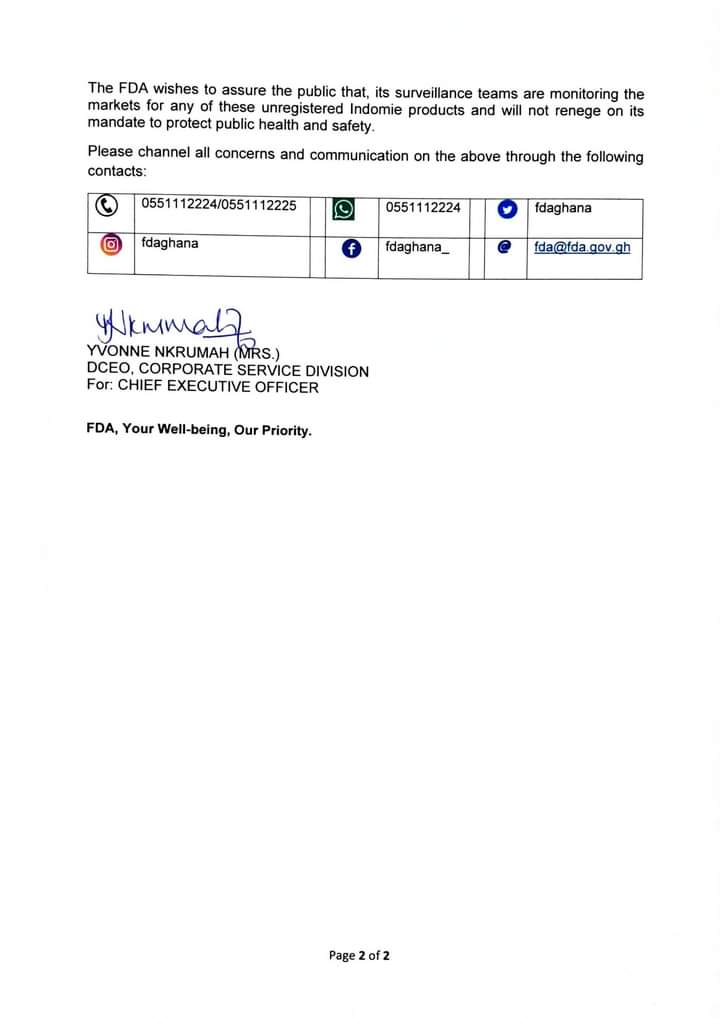 Moreover, it urged all persons with concerns or in possession of the unregistered Indomie products to contact the FDA immediately via their email account fda@fda.gov.gh