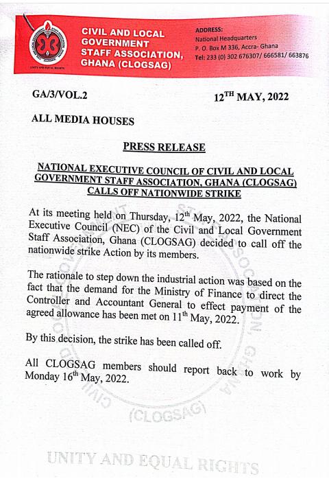In a statement announcing an end to the strike, the leadership of CLOGSAG, said: “The demand for the Ministry of Finance to direct the Controller and Accountant General to effect payment of the agreed allowance has been met on 11 May 2022. By this decision, the strike has been called off.”
