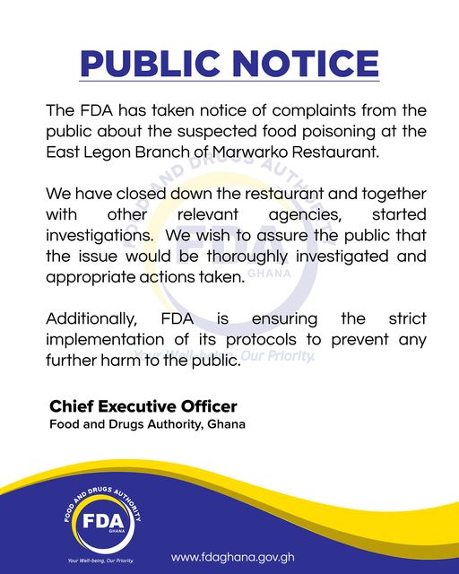 The East Legon branch of Marwarko was closed down by the Food and Drugs Authority following complaints of food poisoning.