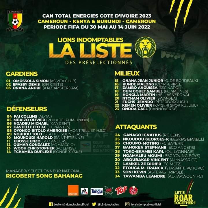 The five-time African champions will host Kenya at the Ahmadou Ahidjo Stadium on Sunday, June 5, 2022, before traveling to play Burundi at the Dar Es Salaam in matchday one and two respectively of the upcoming AFCON qualifiers.