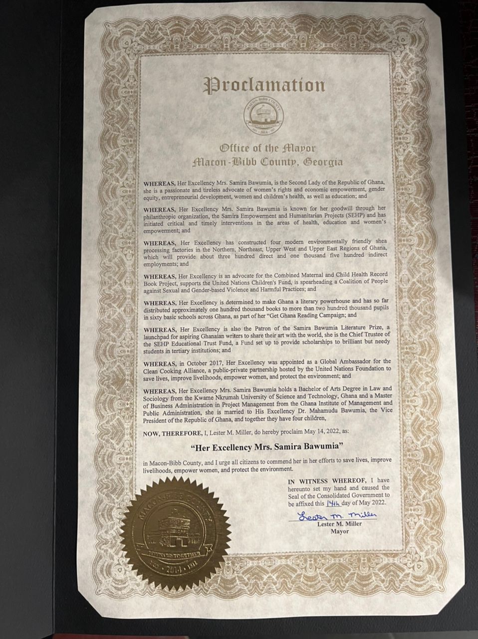 According to a proclamation in effect of the recognition of the wife of the Vice President Dr. Mahamudu Bawumia, the Atlanta City Council said “the membership of the Atalanta City Council on behalf of the citizens of Atlanta do hereby recognize Her Excellency Mrs. Samira Bawumia on this 14th day of May 2022 for her tireless work on the many issues that impact families across the globe.”