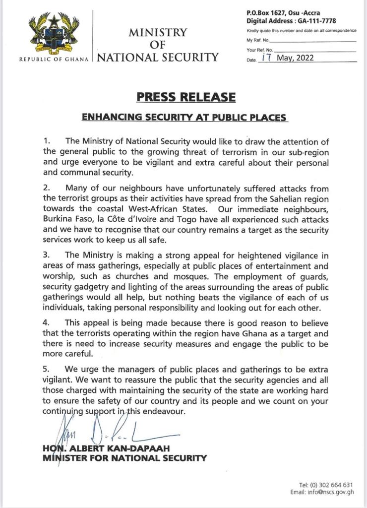 “This appeal is being made because there is good reason to believe that the terrorists operating within the region have Ghana as a target and there is need to increase security measures and engage the public to be more careful”