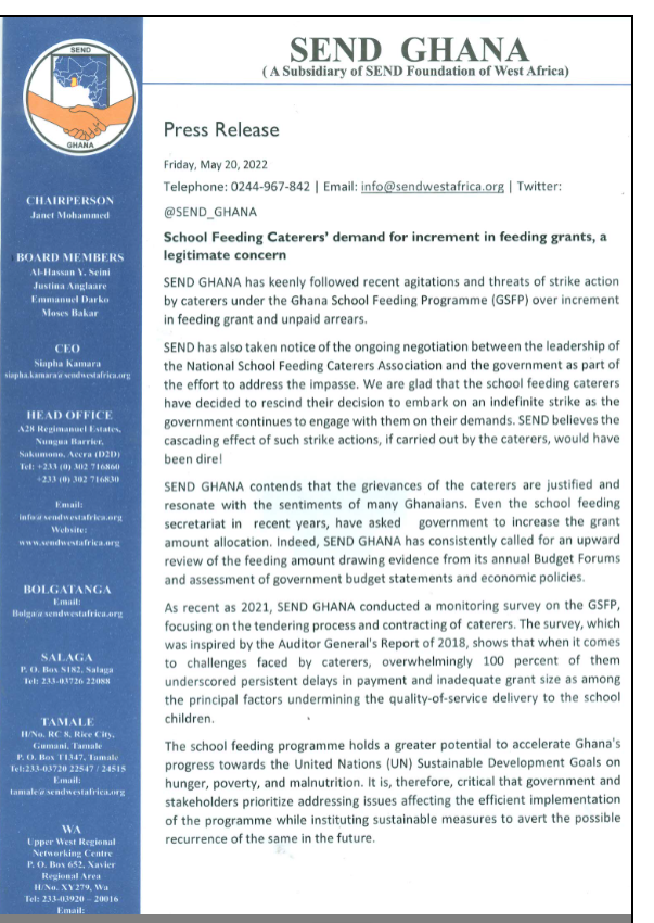 “SEND Ghana has keenly followed recent agitation and threats of strike action by caterers under the Ghana School Feeding Programme over increment in feeding grant and unpaid arrears”