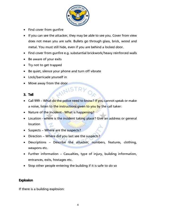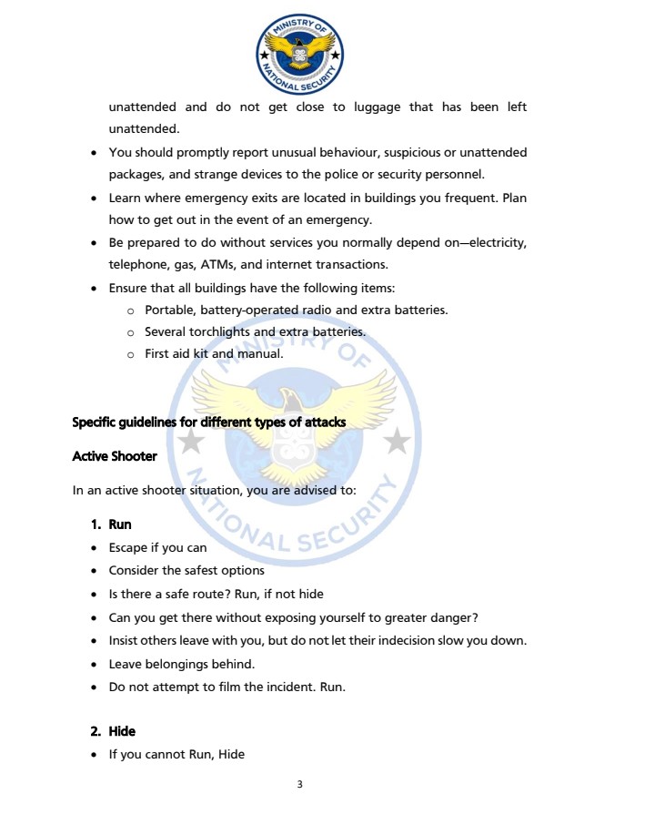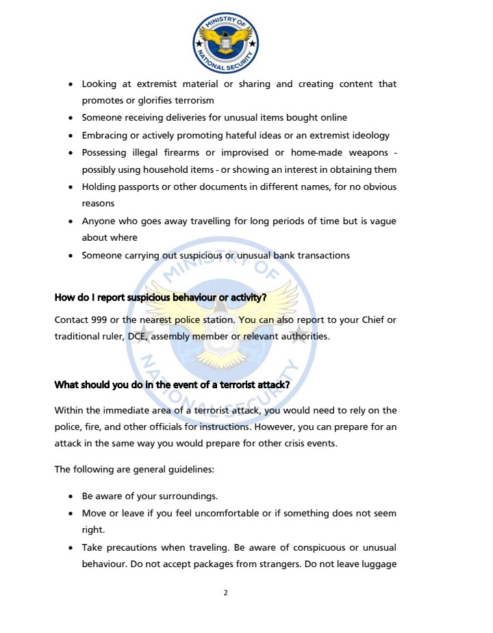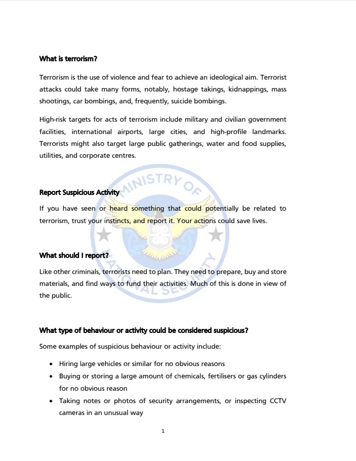 The Ministry of National Security as part of efforts to sensitize the citizenry against the background of possible terror attacks on Ghana, has outlined safety measures to undertake to avert or reduce damage.