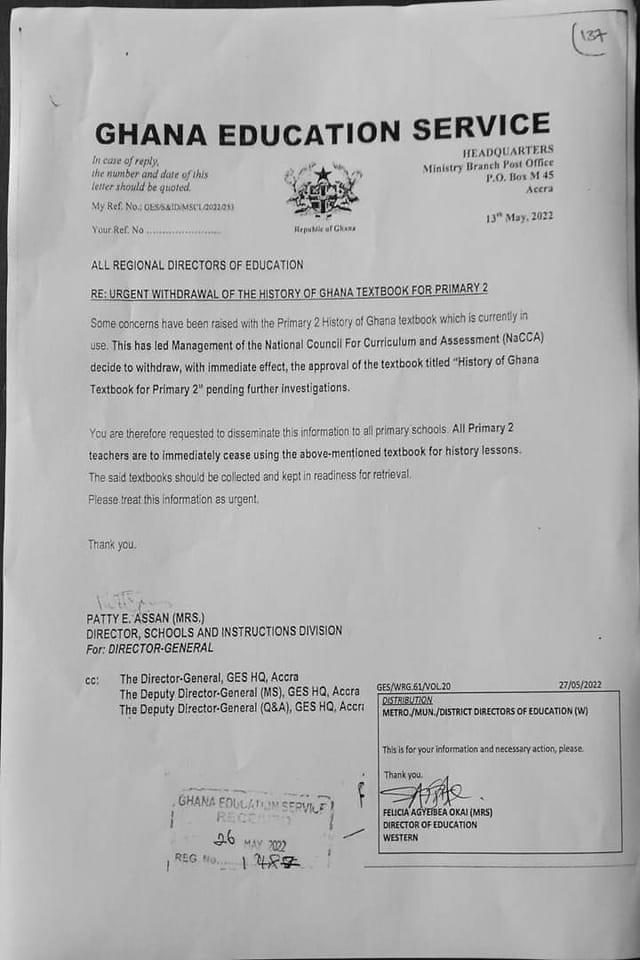 The Ghana Education Service has instructed all teachers of Primary 2 across the country to cease the use of the textbook titled “History of Ghana Textbook for Primary 2” with immediate effect.