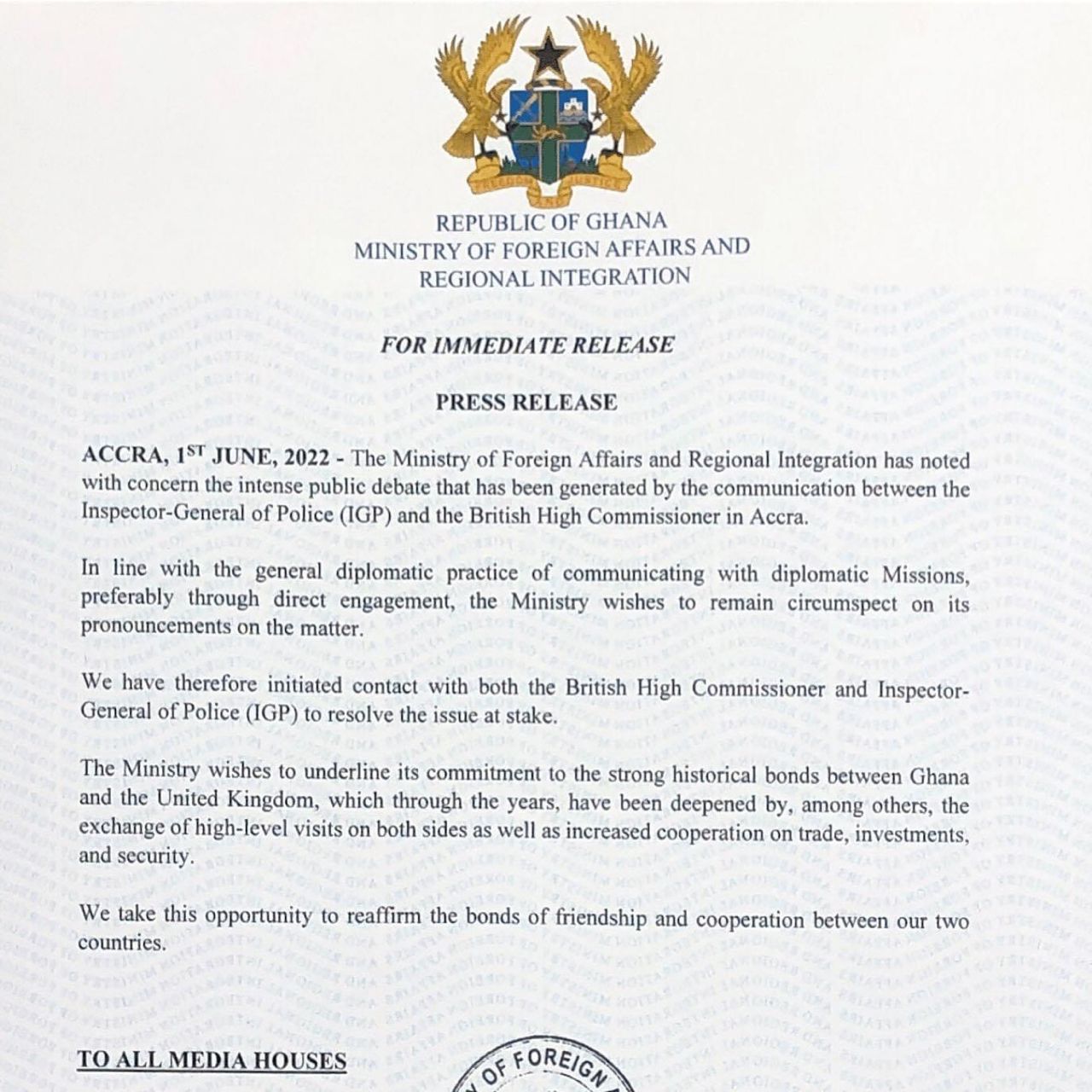 “We have therefore initiated contact with both the British High Commissioner and Inspector-General of Police to resolve the issue at stake,” the Ministry’s statement issued on Wednesday, June 1, 2022 read in part.