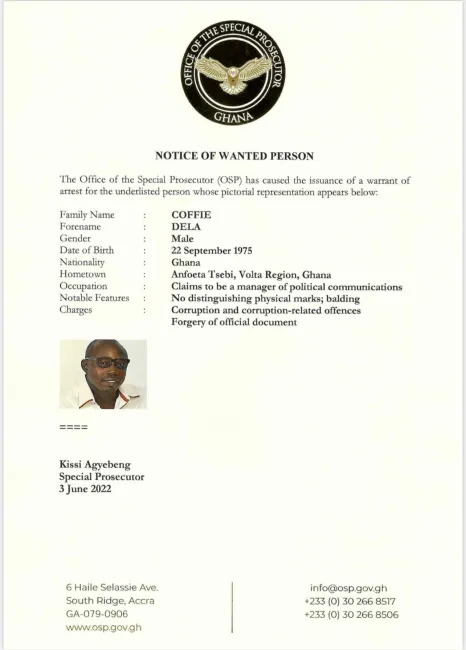 The Office of the Special Prosecutor has declared wanted an activist of the National Democratic Congress (NDC), Dela Coffie, for an alleged “forgery of official document.”