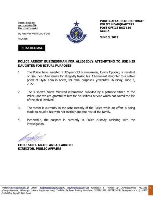 The Ghana Police Service has arrested a 42-year-old businessman for allegedly taking his 11-year-old daughter to a herbalist in Oyibi Kom in Accra for money ritual.