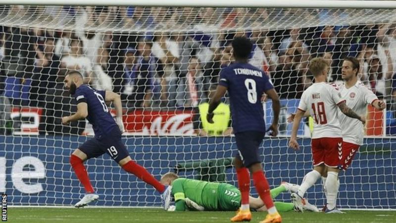 Both sides had several chances in a lively opening game to group A1. In the first half Denmark’s Joakim Maehle hit the outside of the post and Benzema had a goal disallowed for offside.