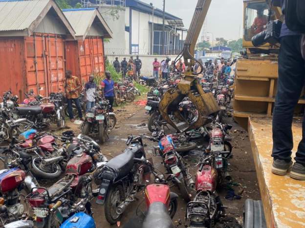 The authorities in Lagos have begun the process of crushing more than 2,000 confiscated motorcycles seized this week as part of the attempts to enforce a ban on motorcycle taxis, known as okadas, in the Nigerian city.