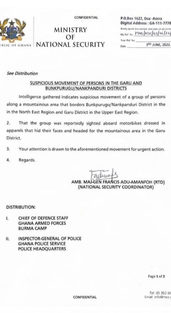 In a statement copied to the Chief of Defence Staff of the Ghana Armed Forces and the Inspector General of Police (IGP), the ministry indicated that the group which was sighted was “aboard motorbikes dressed in apparel that hid their faces and headed for the mountainous area in the Garu district.”