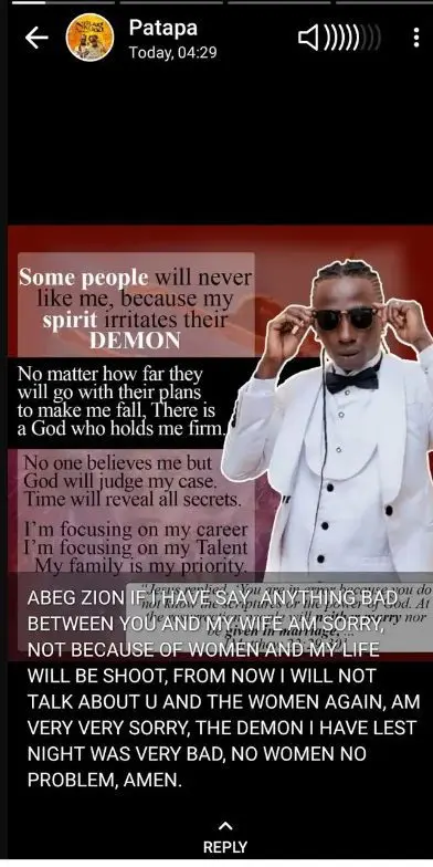 Patapaa Amisty’s Apology message to ZionFelix on his Whatsapp status