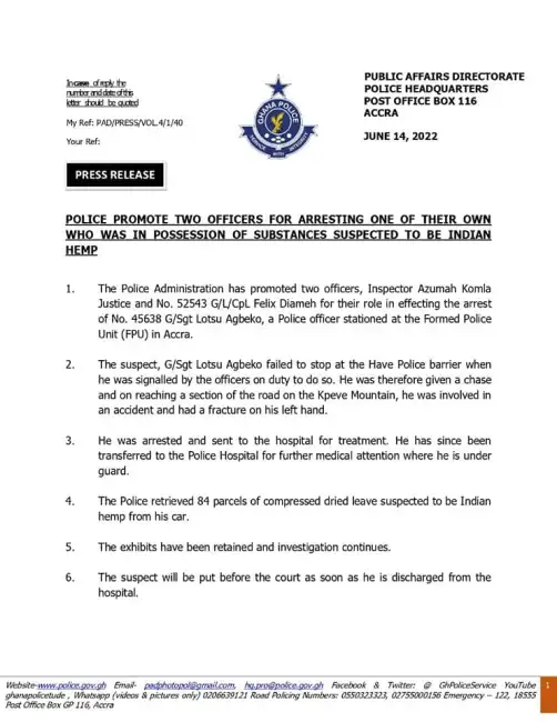 The Police Administration has promoted two cops for their role in effecting the arrest of one Sgt Lotsu Agbeko for possessing substances believed to be Indian hemp.