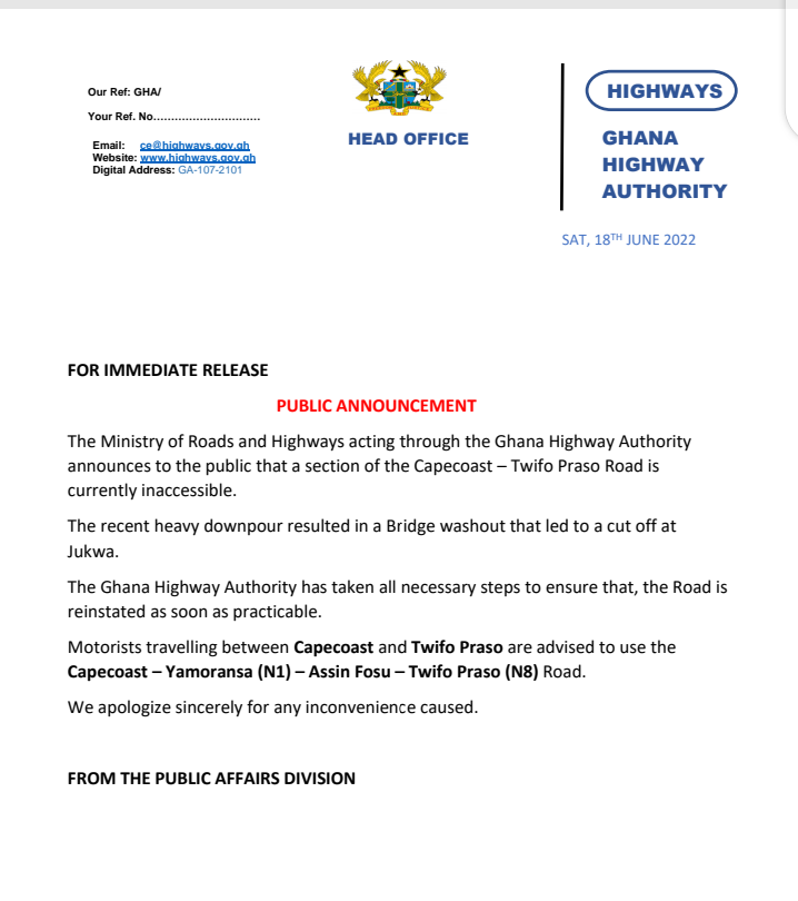 “Motorists traveling between Cape Coast and Twifo Praso are advised to use the Cape Coast – Yamoransa (N1)- Assin Fosu – Twifo Praso (N8) road,” it said in a statement.