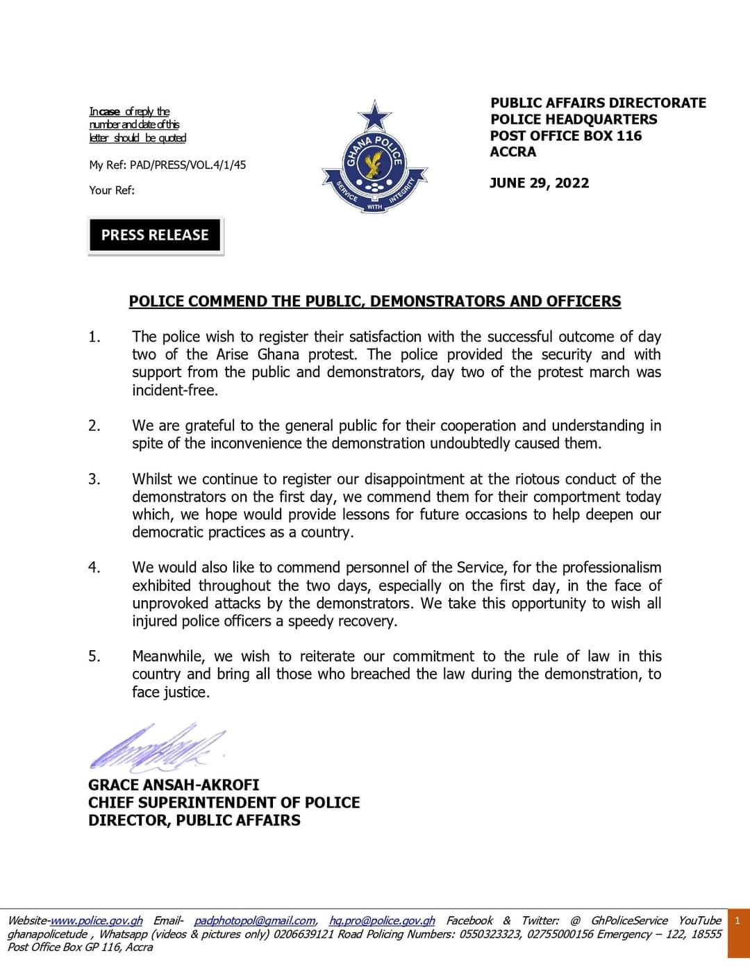 The Ghana Police Service has commended “Arise Ghana” protestors for comporting themselves for a successful outcome during day two of their protest.