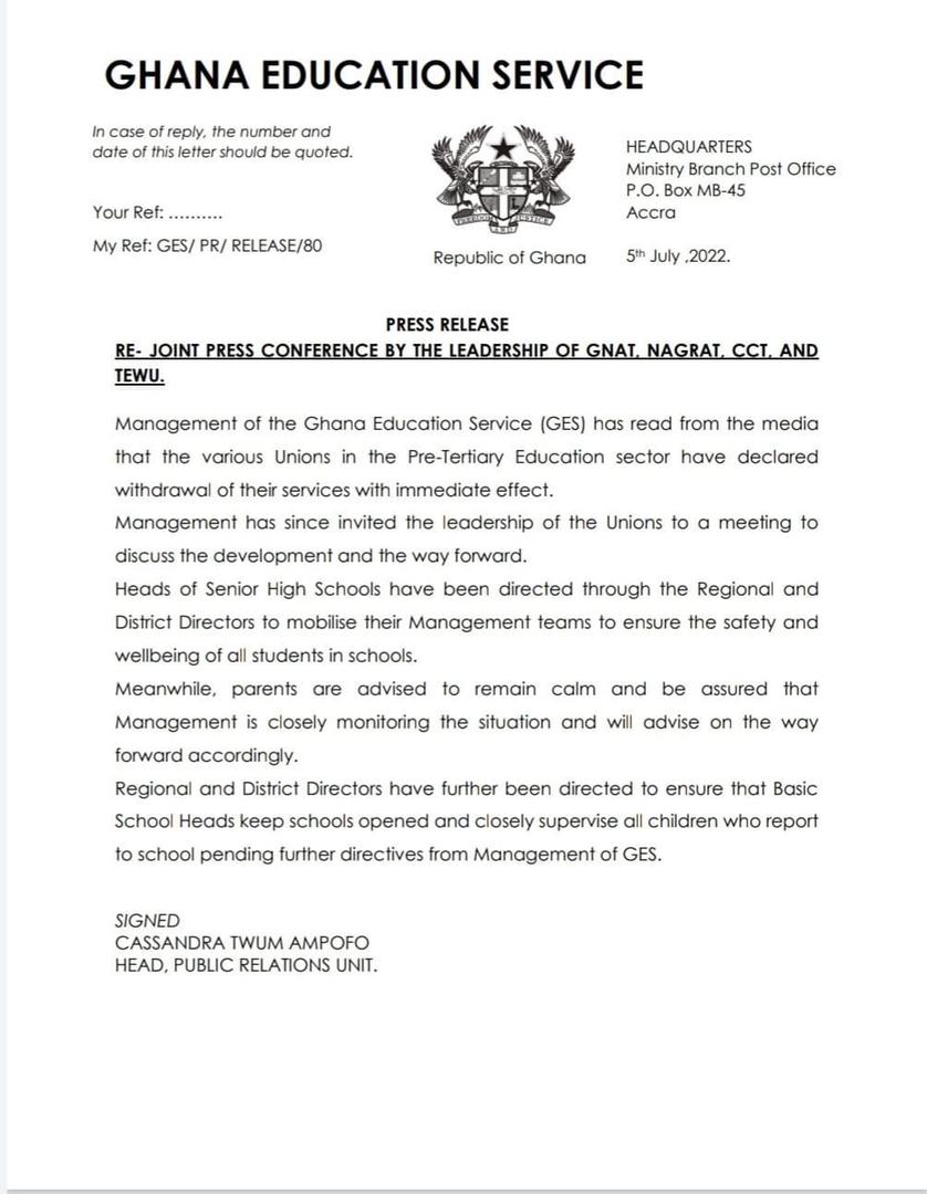 The statement signed by Cassandra Twum Ampofo, Head of the Public Relations Unit of GES, advised parents to remain calm and be assured that management is closely monitoring the situation and will advise on the way forward accordingly.