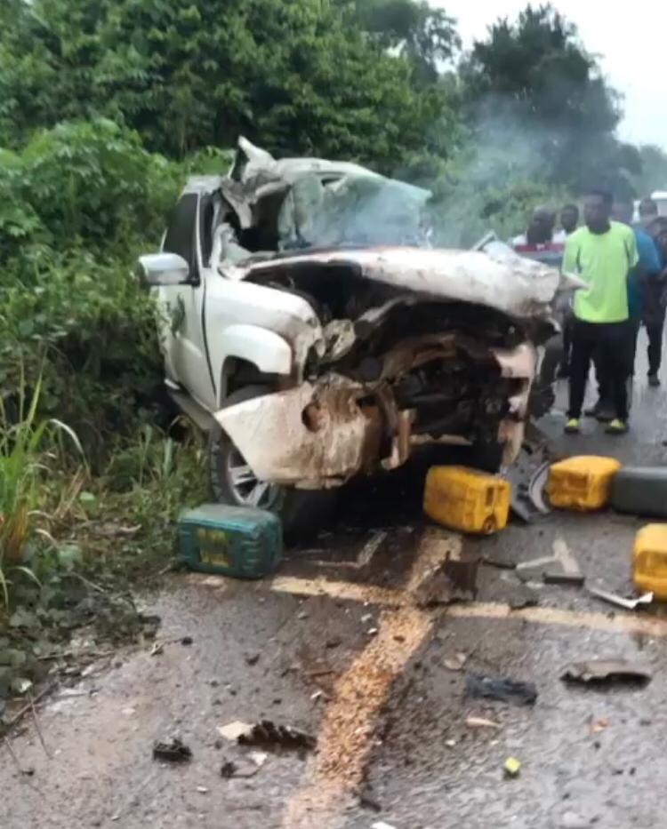 On reaching a section of the road at Akim Fisher on the Accra-Kumasi Highway, a Man Diesel Articulated truck with the registration No. AS 4229-X from Kumasi direction veered off its lane and crashed head-on with the Nissan Patrol 4×4.