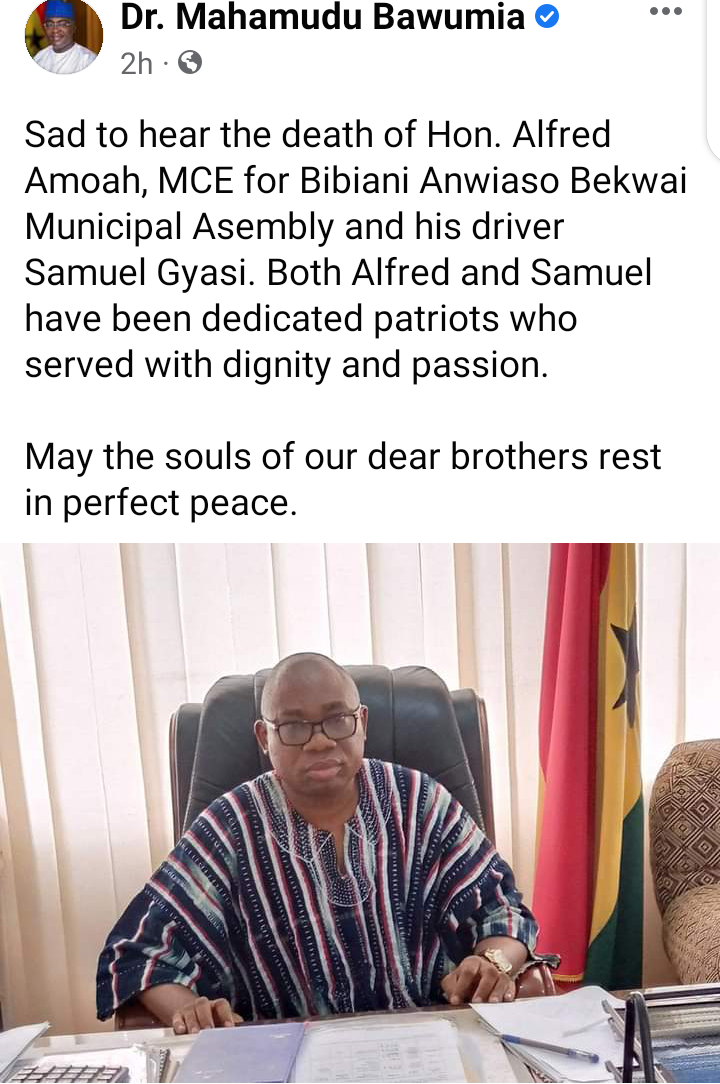 “Sad to hear the death of Hon. Alfred Amoah, MCE for Bibiani Anwiaso Bekwai Municipal Asembly and his driver Samuel Gyasi. Both Alfred and Samuel have been dedicated patriots who served with dignity and passion”, Dr. Bawumia wrote on his official Facebook page.
