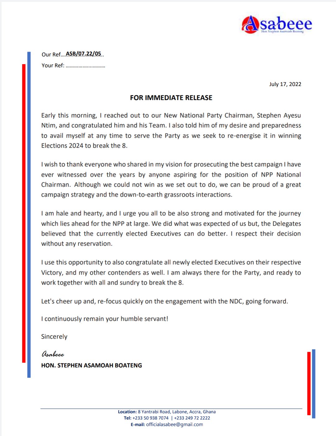 “I am hale and hearty, and I urge you all to be also strong and motivated for the journey which lies ahead for the NPP at large. We did what was expected of us but, the Delegates believed that the currently elected Executives can do better. I respect their decision without any reservation” Asabee noted.