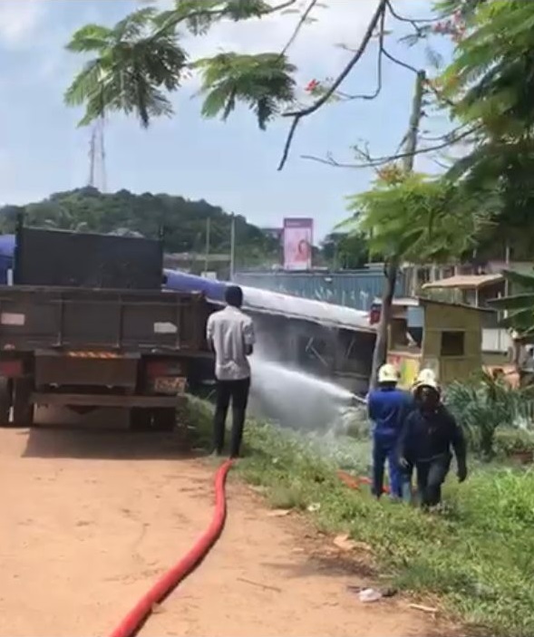 A tanker carrying about 27,000 litters of fuel has overturned on the road between Effia and Fijai.