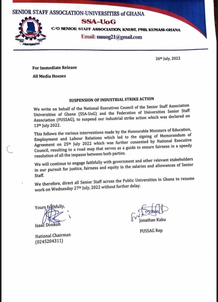 The association therefore, directs all senior staff across the public universities in Ghana to resume work effective today, Wednesday, July 27, 2022, without further delay.