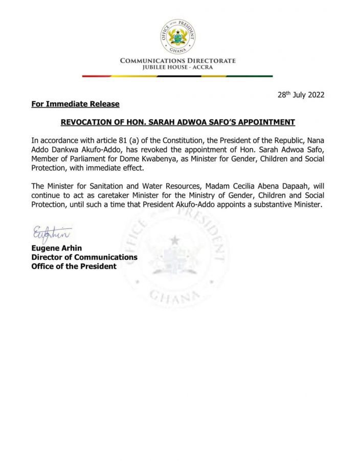 According to the statement, Minister for Sanitation and Water Resources, Cecilia Abena Dapaah will continue to act as caretaker minister for the Gender Ministry until a substantive Minister is appointed by the President.