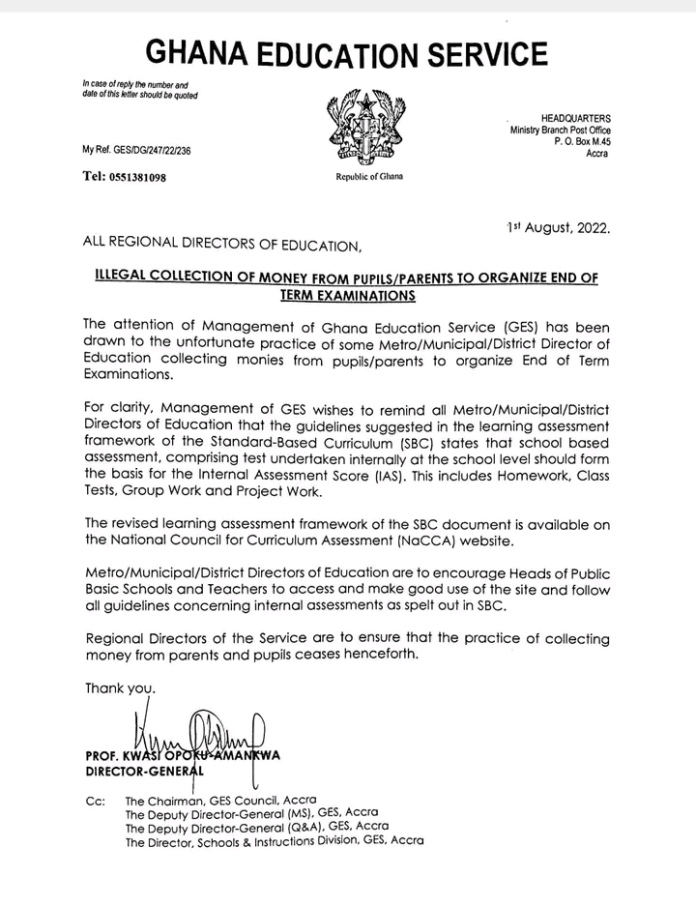 The Ghana Education Service (GES) has warned its directors within the various Metropolitan, Municipal and Districts against the practice of collecting illegal monies from pupils and parents for end-of-term examination fees.