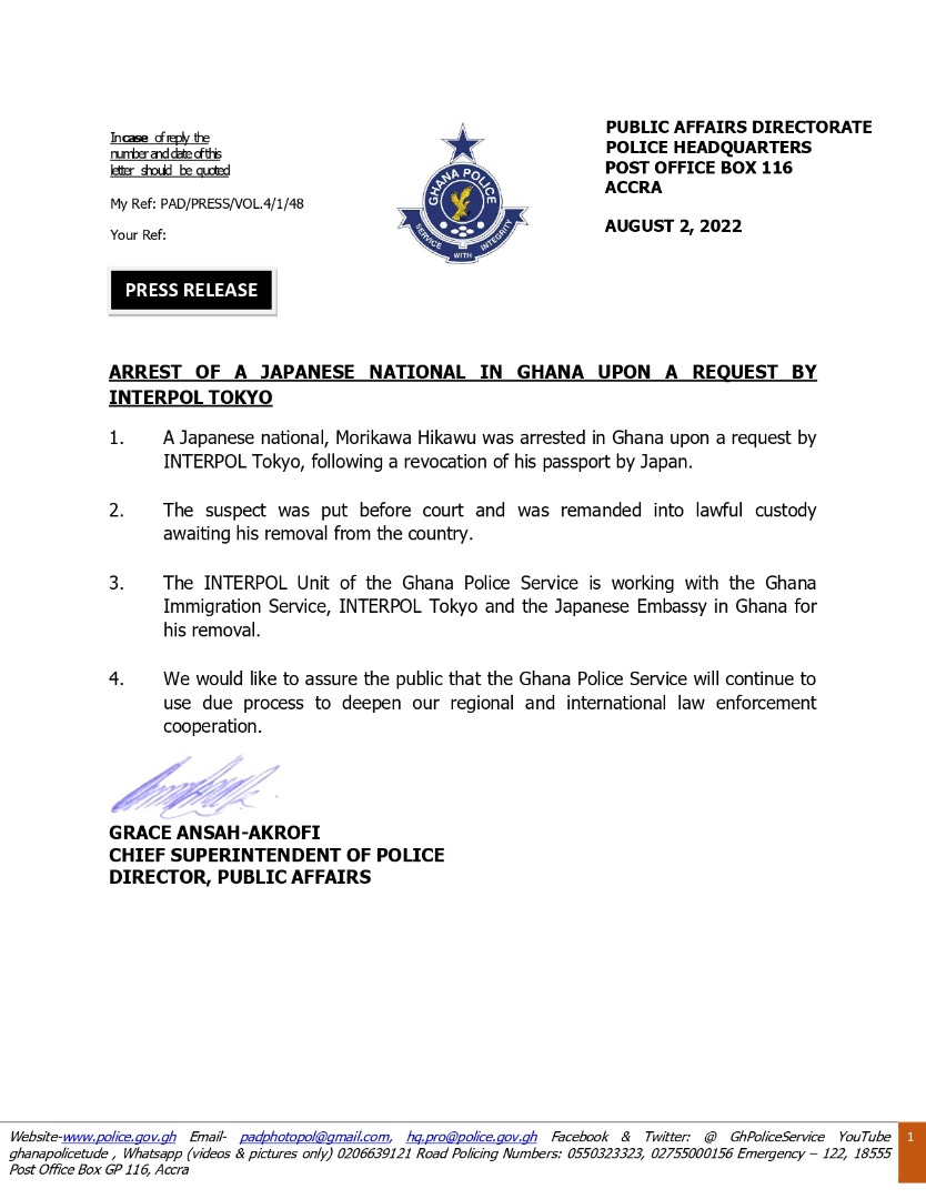 “The INTERPOL Unit of the Ghana Police Service is working with the Ghana Immigration Service, INTERPOL Tokyo, and the Japanese Embassy in Ghana for his removal,” the statement added.