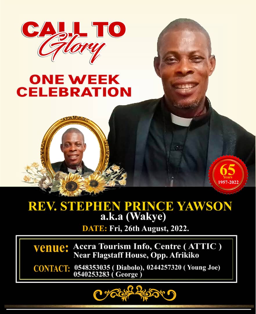 The family of the late veteran actor, Reverend Stephen Prince Yawson, popularly known as Wakye have slated the observation of the one-week passing of their relative for later this month, August.