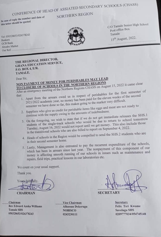 The Northern region chapter of the Conference of Heads of Assisted Secondary Schools (CHASS) has threatened to close down schools in the region following the government’s non-payment of money for perishables.