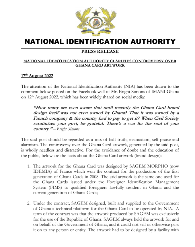 The National Identification Authority (NIA) has condemned a Facebook post by the Vice President of IMANI Ghana, Bright Simons on the artwork of the Ghana Card.