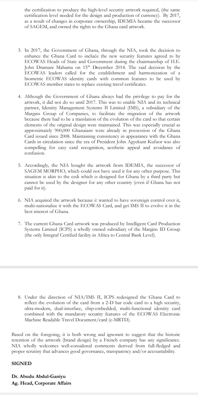 It emphasized that NIA acquired the artwork because it wanted to have sovereign control over it, multi-nationalize it with the ECOWAS Card, and get IMS II to evolve it in the best interest of Ghana.