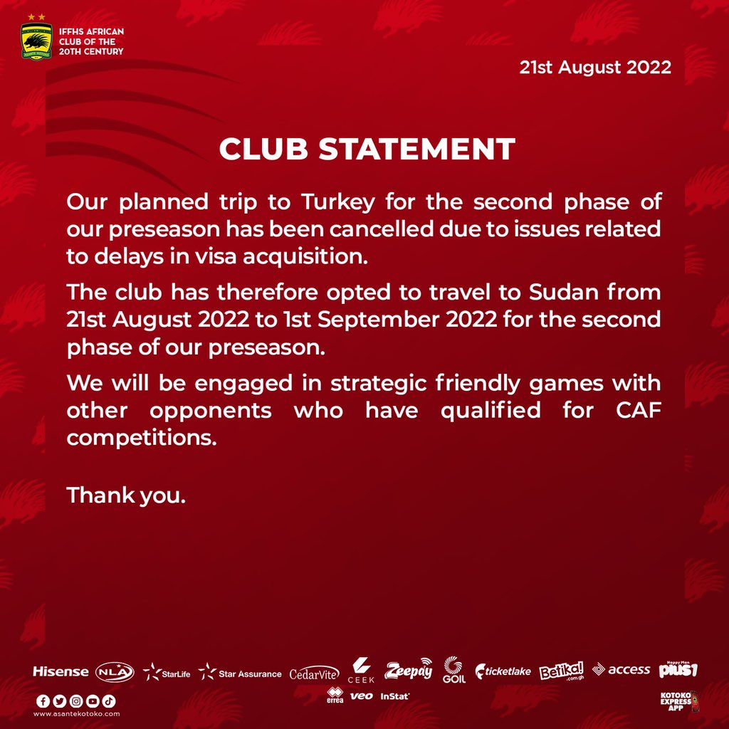 “The club has therefore opted to travel to Sudan from 21st August 2022 to 1st September 2022 for the second phase of our preseason.”