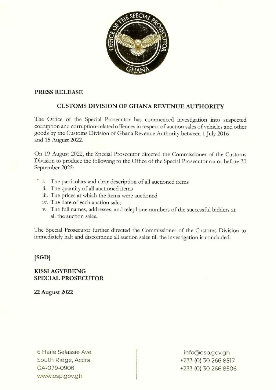 The Special Prosecutor, Kissi Agyebeng, has asked the Customs Division of the Ghana Revenue Authority to immediately halt and discontinue “all auction sales” of vehicles and other goods.
