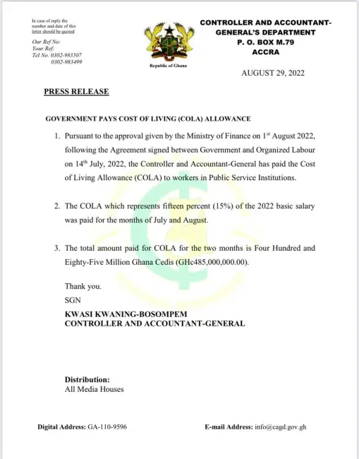 The government through the Controller and Accountant General’s Department (CAGD) has released a total sum of GH₵485 million for the monthly 15% Cost of Living Allowance (COLA) to workers.