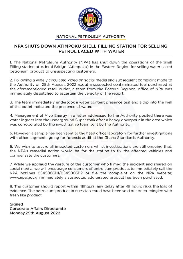 The National Petroleum Authority (NPA) has shut down a Shell fuel filling station at Atimpoku, Eastern region, for allegedly selling water-laced petroleum products to unsuspecting customers.