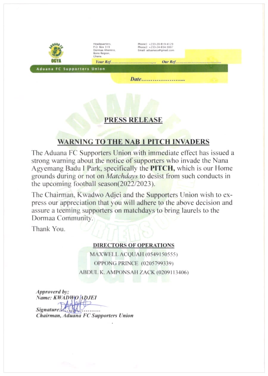 “The Aduana FC Supporters Union with immediate effect has issued a strong warning about the notice of supporters who invade the Nana Agyemang Badu I Park, specifically the pitch which is our home grounds during or not on Matchdays to desist from such conducts in the upcoming football season,” it warned in a statement.