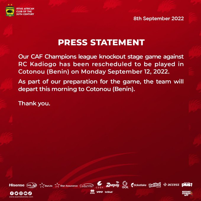 “Our CAF Champions League knockout stage game against RC Kadiogo has been rescheduled to be played in Cotonou (Benin) on Monday, September 12, 2022,” the statement confirmed.