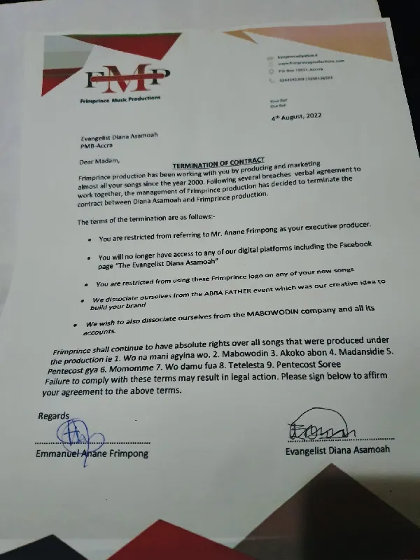 After 2 decades of working together, the partnership between gospel musician Evangelist Diana Asamoah and FRIMPRINCE Music Production has been terminated, the management of the recording label has announced.