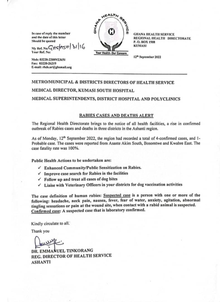 In an alert issued to all health facilities, the Regional Health Directorate confirmed the outbreak of rabies cases as well as deaths in three districts within the region.